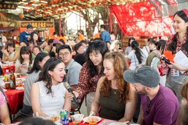 現場也安排台語小遊戲、〈你是我的花朵〉大合舞與擲筊體驗等互動節目,成功拉近跨文化距離。尾聲以台式「呼搭啦」敬酒與逐桌致意,氣氛溫馨熱鬧,讓國際學生對台灣文化留下深刻印象。